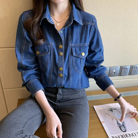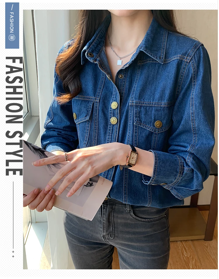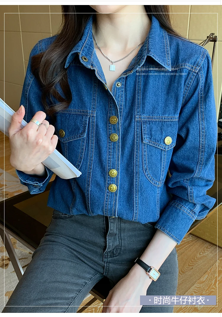 9008Blue denim shirt women's spring and autumn French retro layered shirt vest two-piece gold button heavy-duty coat top