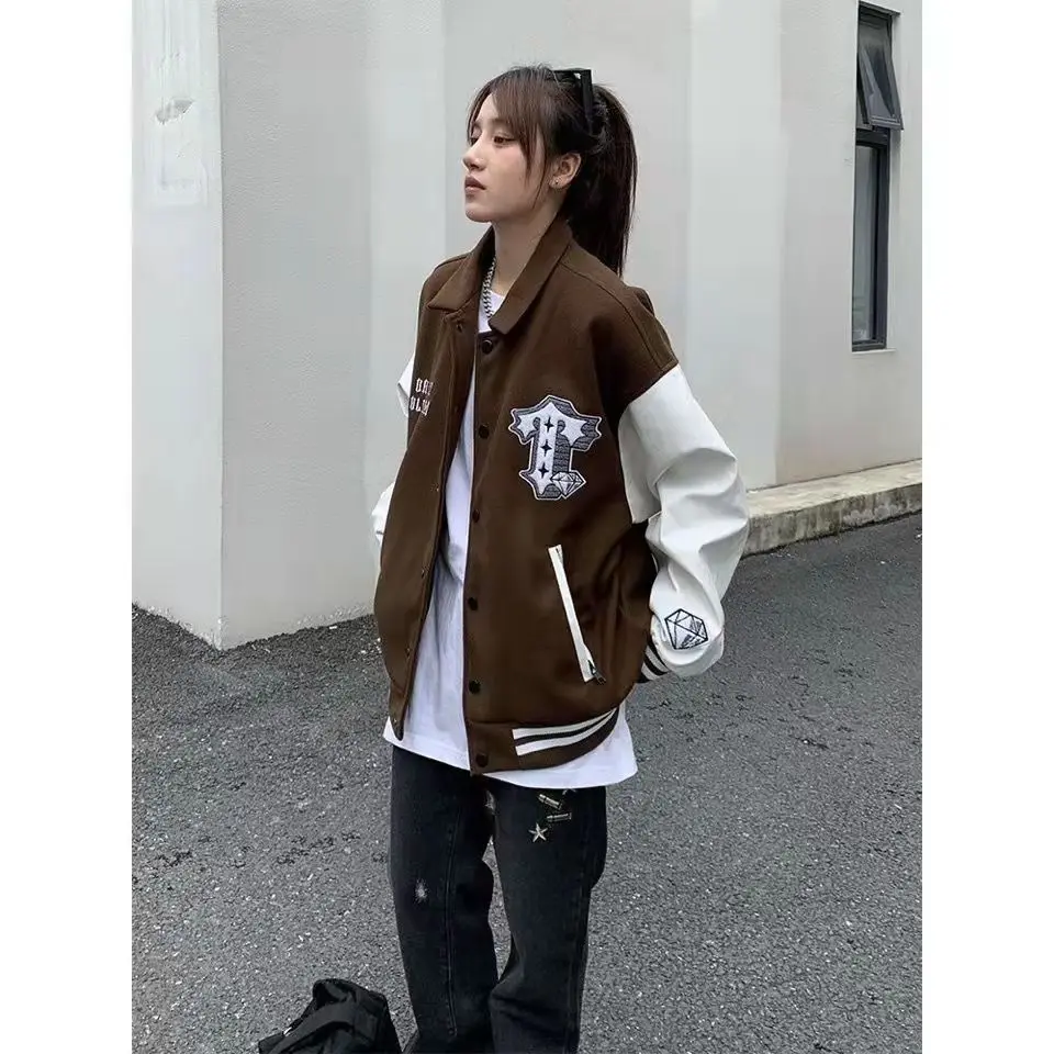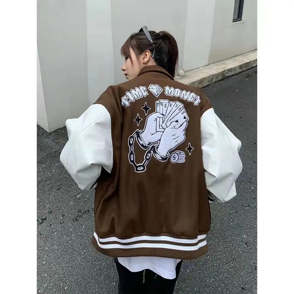 New Autumn Poker Embroidered Baseball Jacket Streetwear Female Jackets Leather Sleeve Men Women Couples American Street Loose