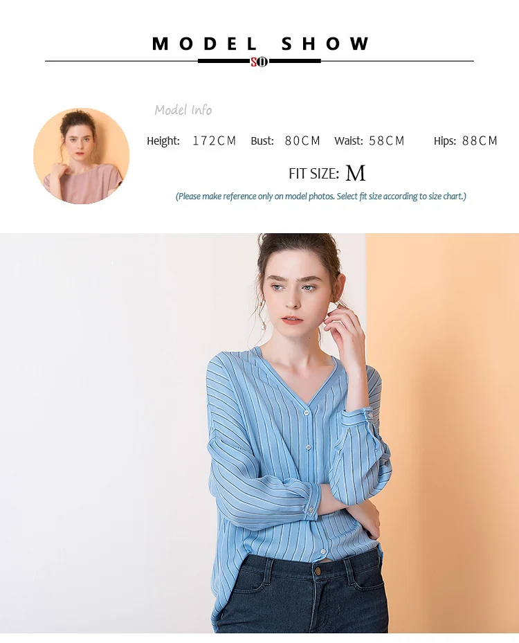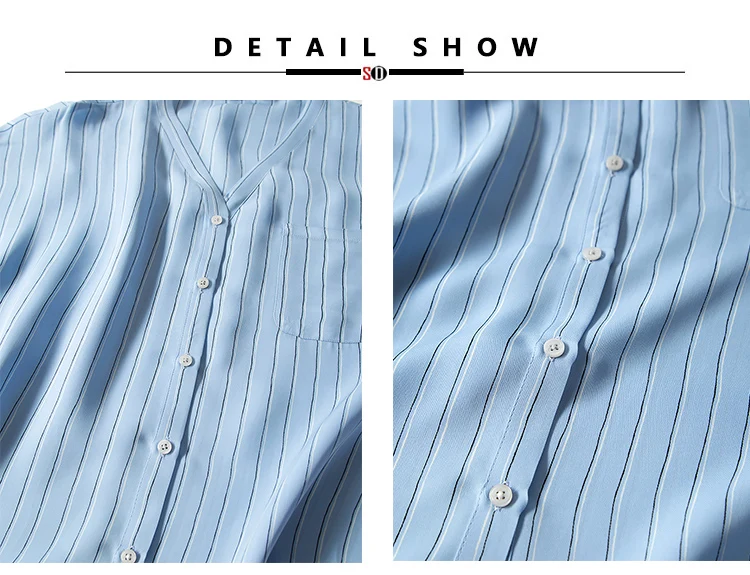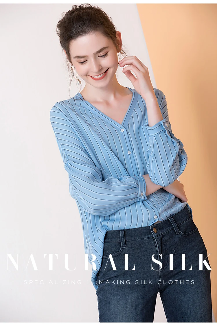 SuyaDream Women Striped Shirts 100%Silk Crepe de chine V neck Blue Chic Blouses 2022 Spring Summer Loose Top