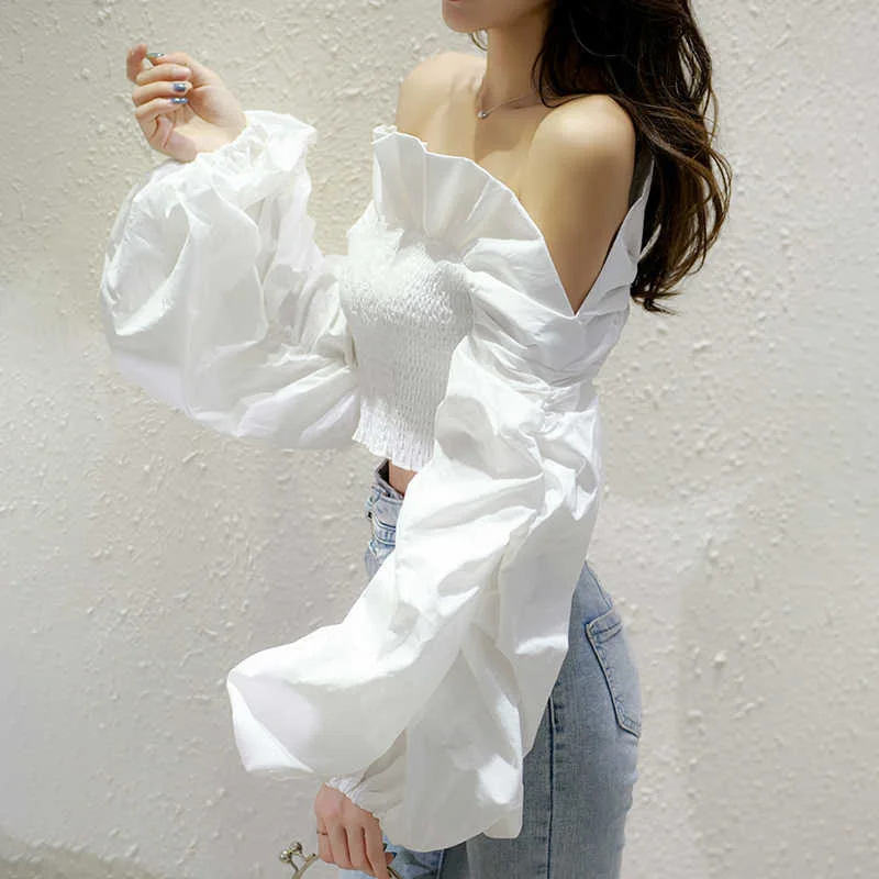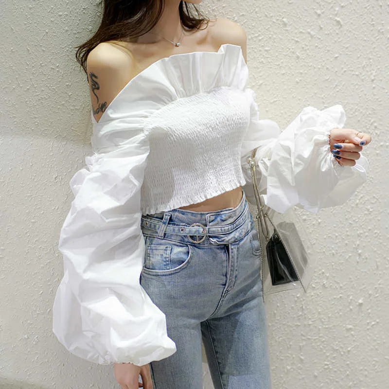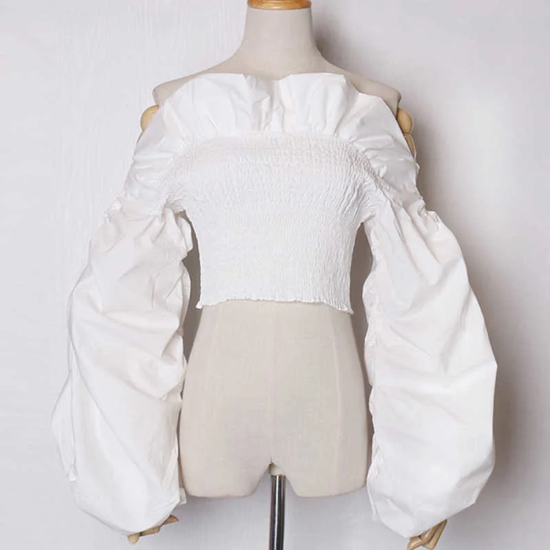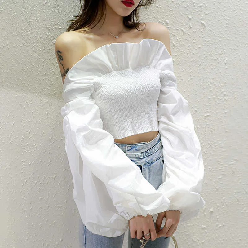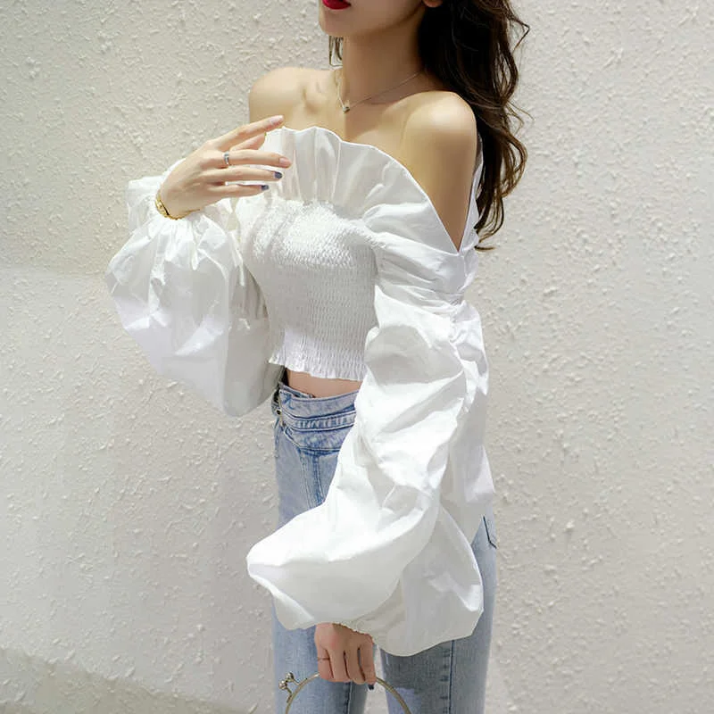 TWOTWINSTYLE Sexy White Slim Shirt For Women Slash Neck Lantern Sleeve Patchwork Ruffle Short Shirts Female Fashion New Stylish