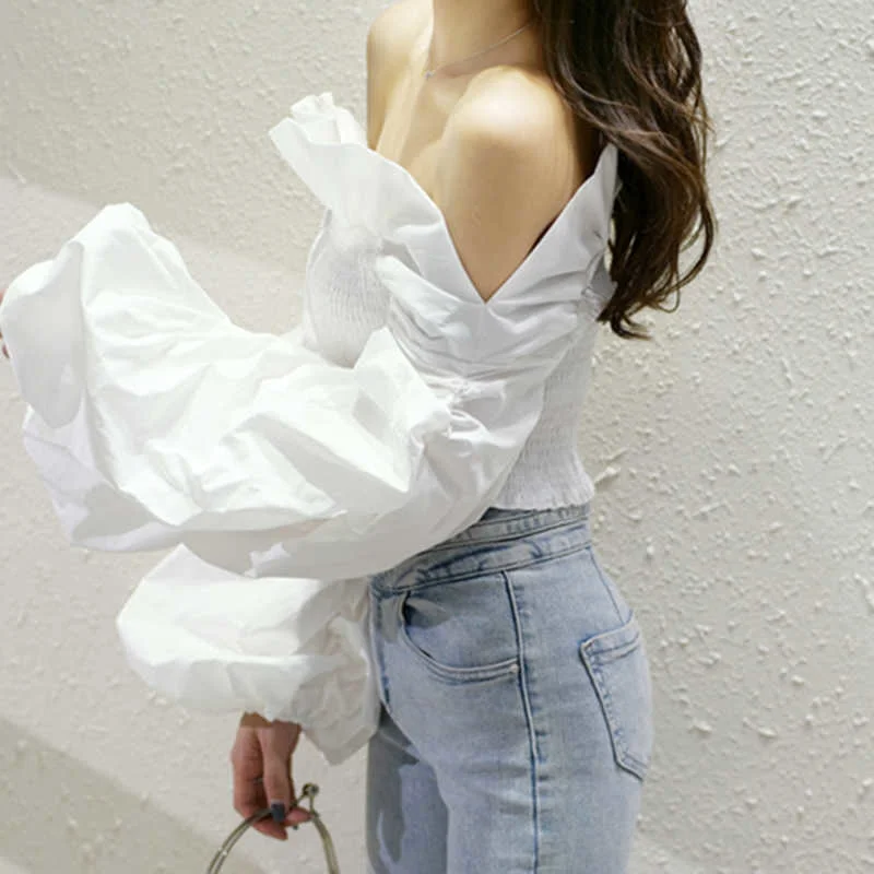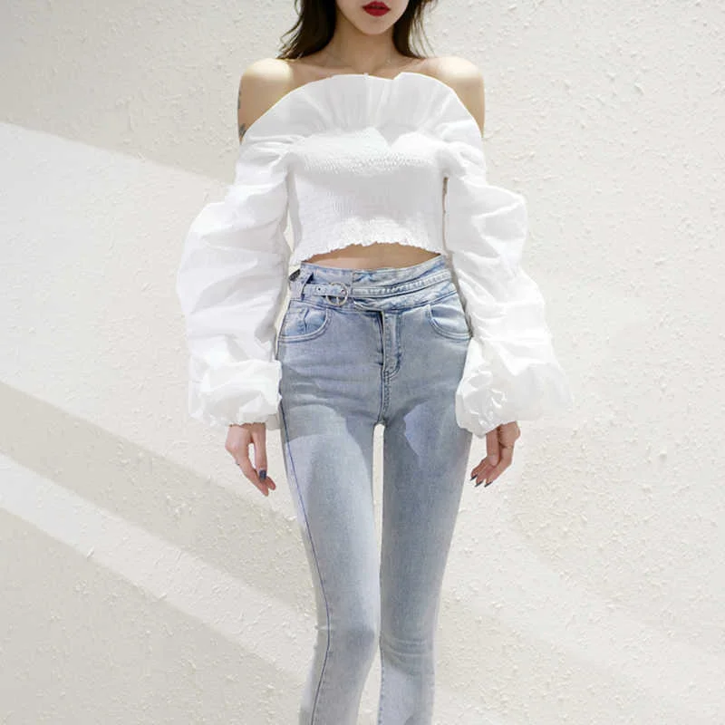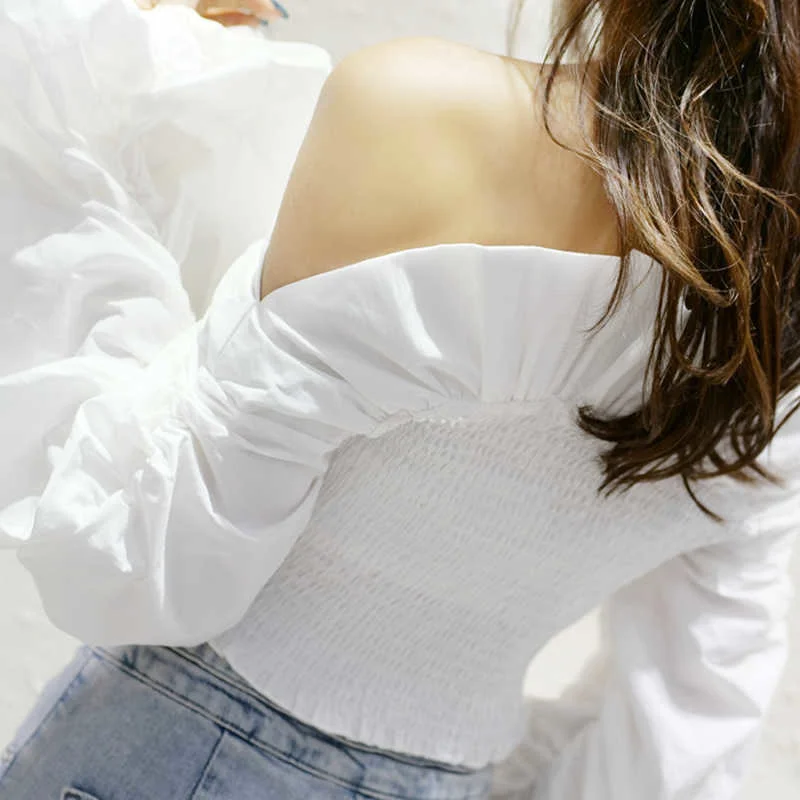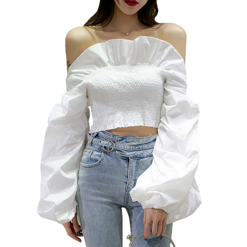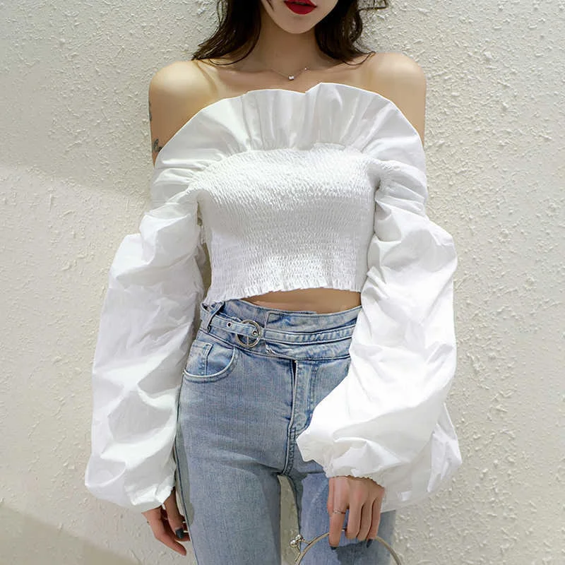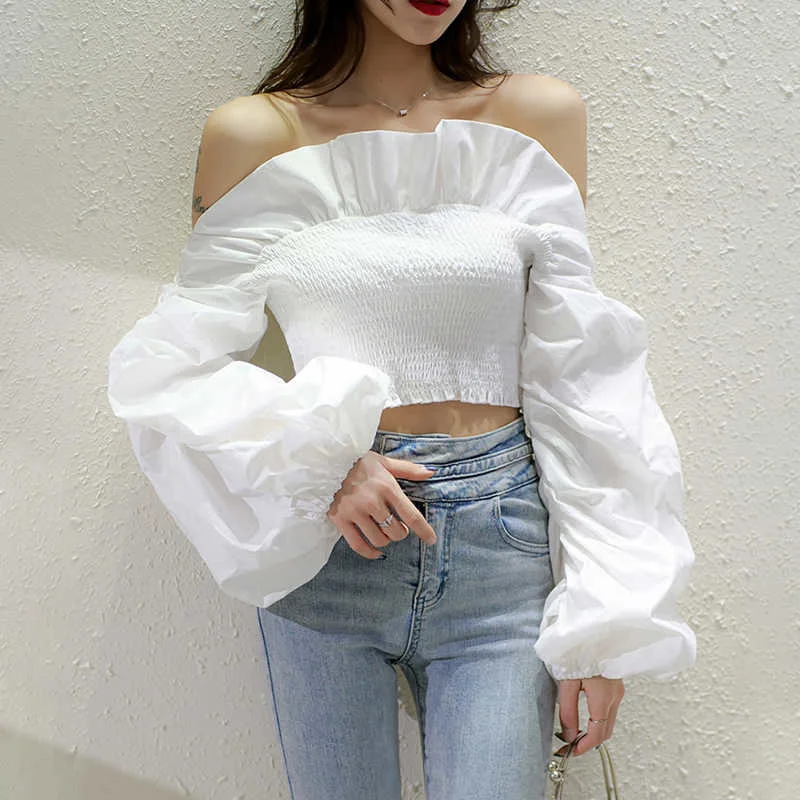 TWOTWINSTYLE Sexy White Slim Shirt For Women Slash Neck Lantern Sleeve Patchwork Ruffle Short Shirts Female Fashion New Stylish