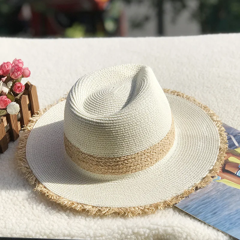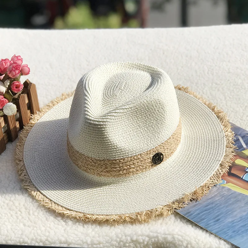 Women Sun Hat Raffia Straw Beach Hat Handmade Woven Jazz Hat Sun Block UV Protection Wide Brim Visor Hats Men Panama Hat Fedora